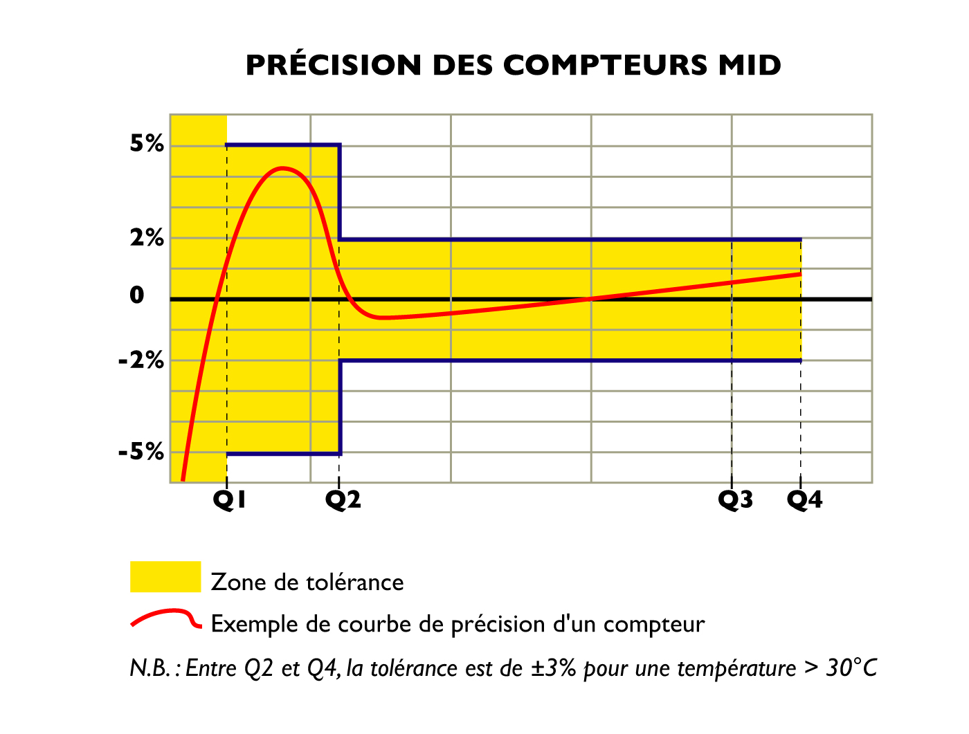 La nouvelle directive MID détermine le calibrage des compteurs selon 20 classes de précision (du moins précis R10, au plus précis R800) alors que l’ancienne n’en comportait que 3 (A, B et C).