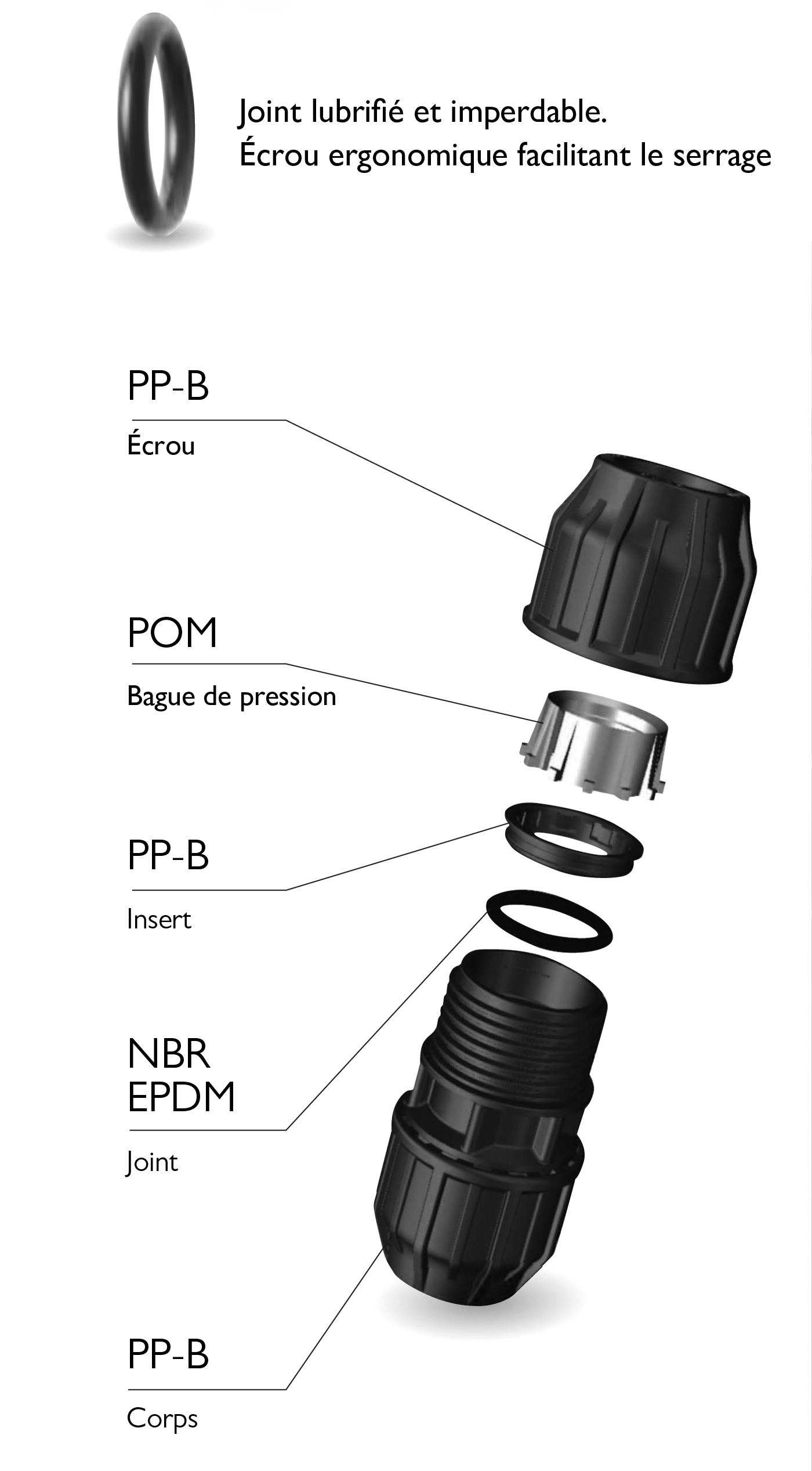 Joint lubrifié et imperdable. Écrou ergonomique facilitant le serrage