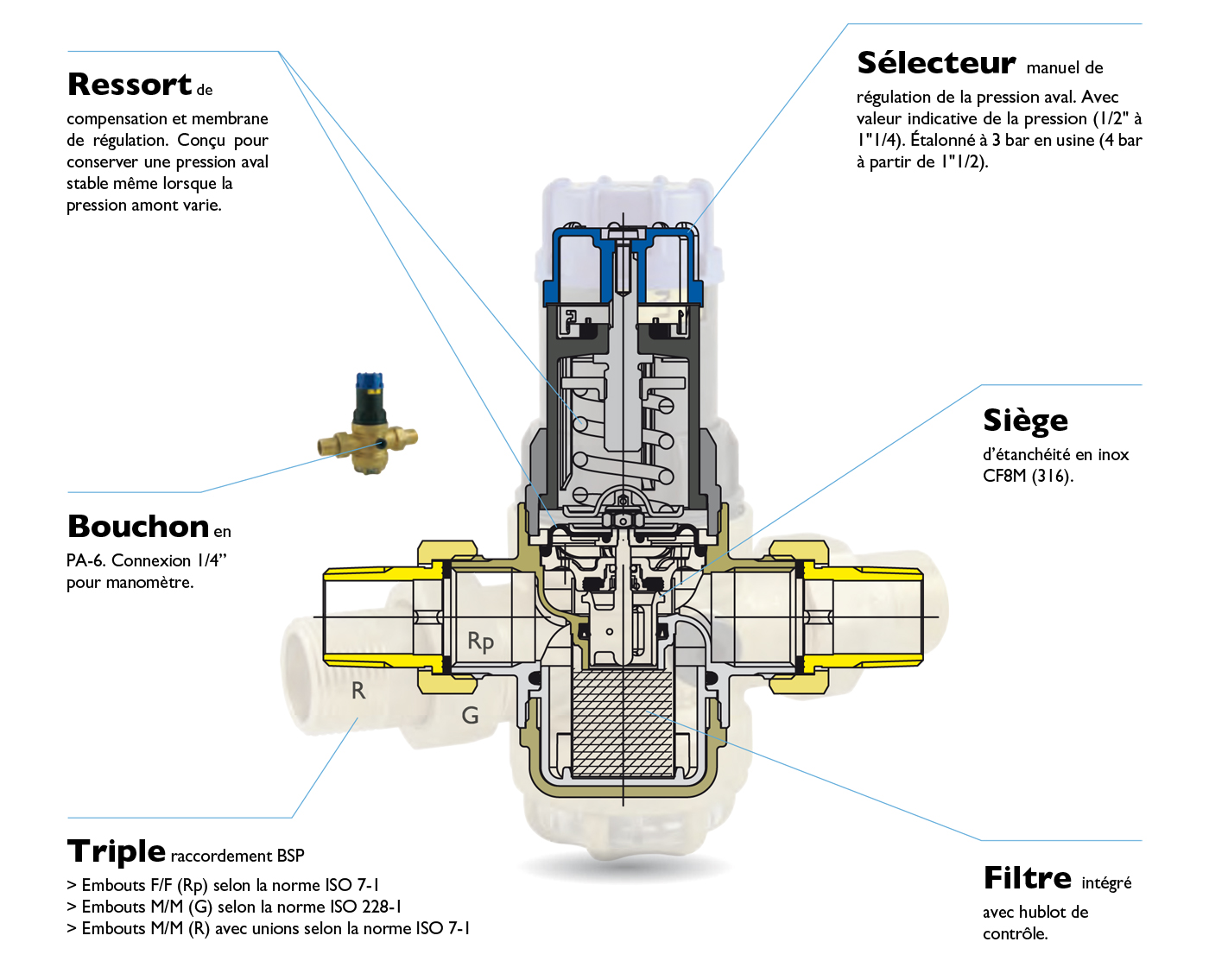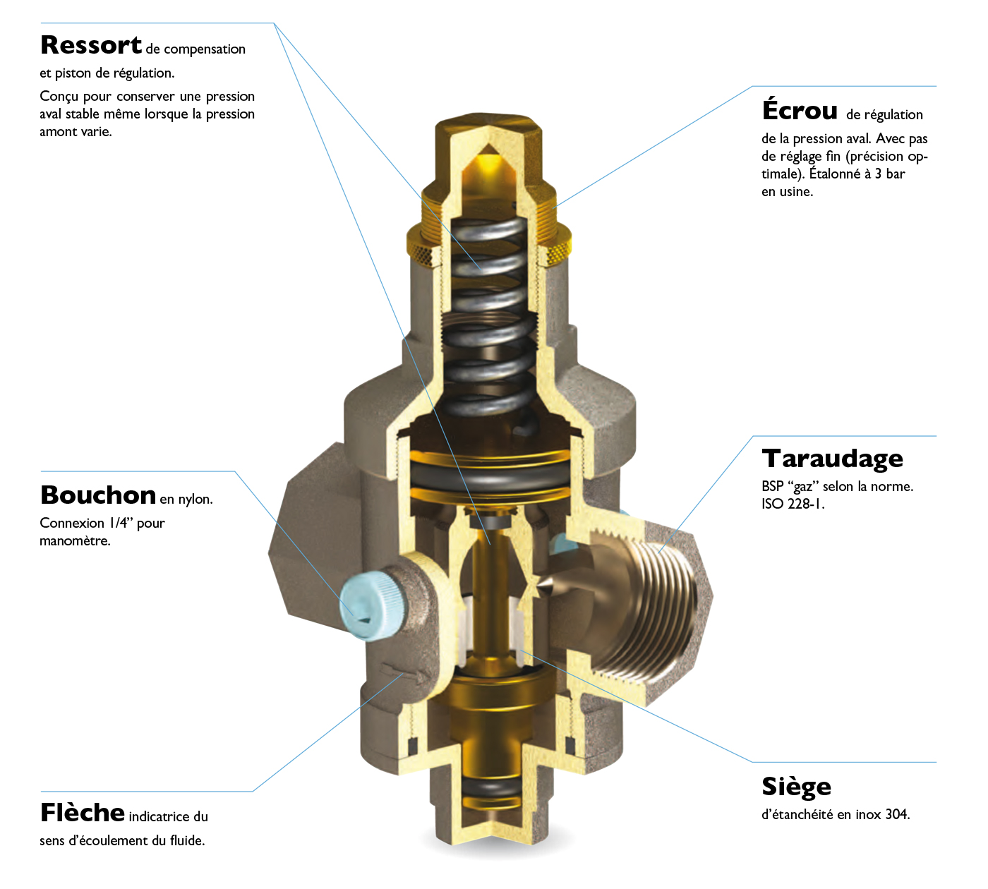FONCTION DE STABILISATEUR : Lorsque la pression varie en amont, la pression en aval ne varie que de 8% de la variation (ex : amont +5 bar → aval +0.4 bar). L’impact pour l’utilisateur est négligeable.